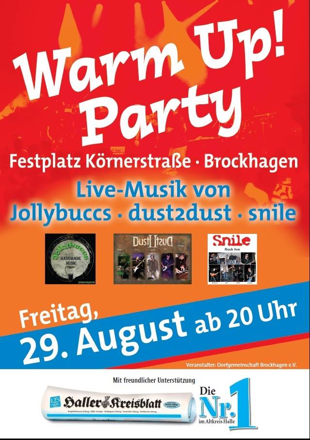 Zur Eingewöhnung passt gleich das Motto des ersten Abends: »Brockhagen Warm up«. Drei Bands versprechen für Freitag, 29. August, Partystimmung im 600 Quadratmeter großen Festzelt: die »Jollybuccs« mit Acoustic Folk Music, »Dust II Dust« mit eigenen rockigen Kompositionen und beliebten Coversongs sowie »Snile« mit old school Rock und Blues.