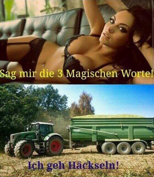 Ich geh Häckseln! Stimmt auch nicht. Er fährt den Häcksel nur weg, der Häcksler ist hier gar nicht zu sehn. lach